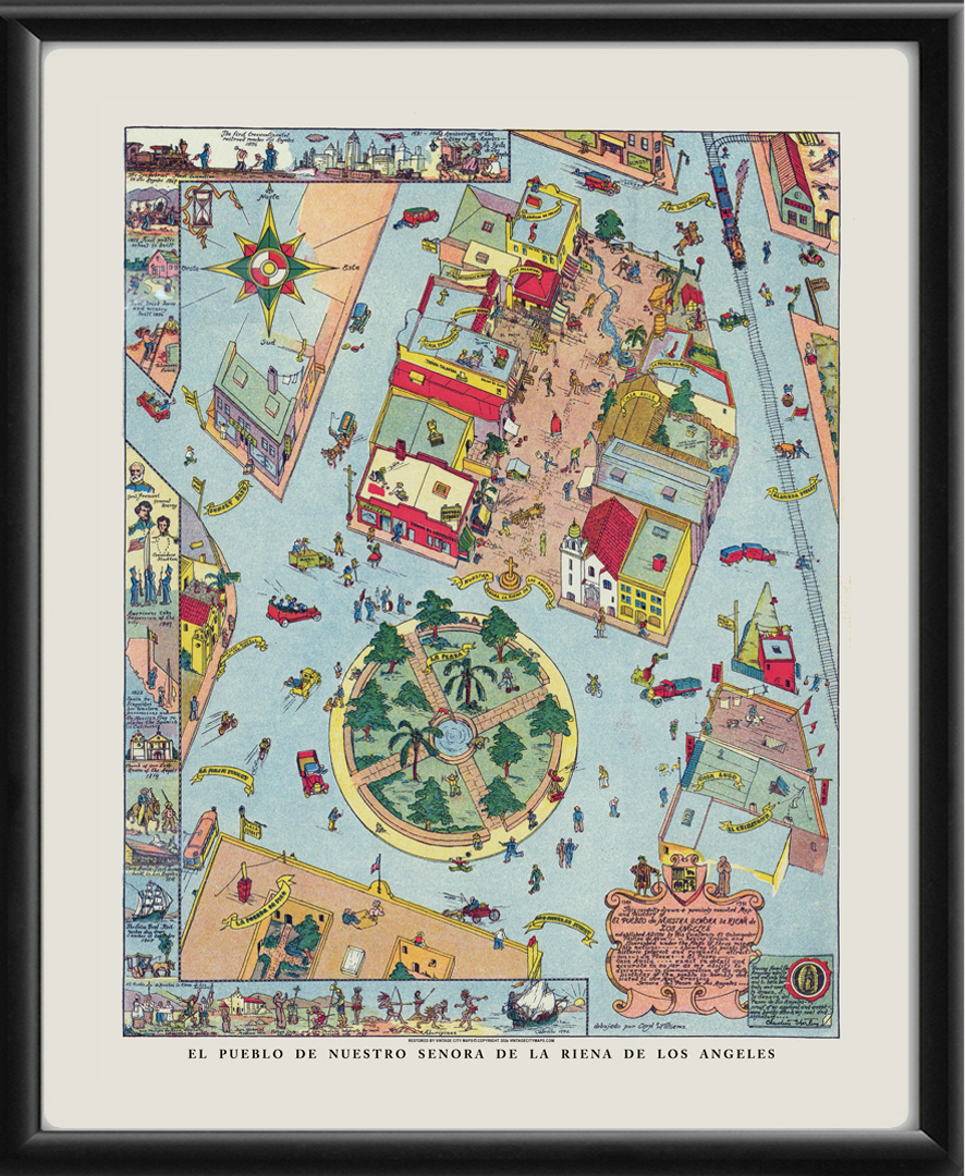 Restored pictorial bird’s eye view of El Pueblo de Nuestro Senora de la Reina de Los Angeles, 1931 by Caryl Williams