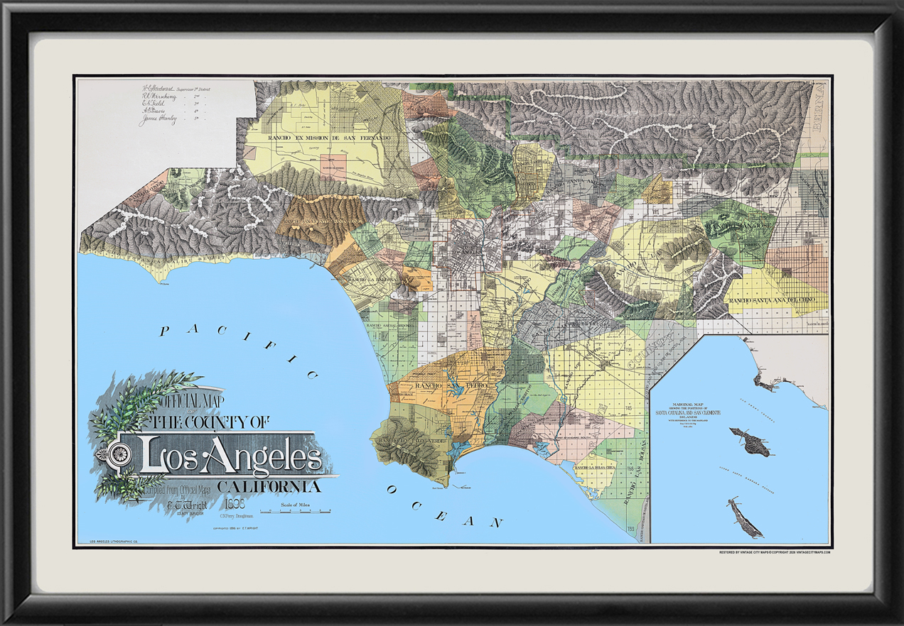 Restored bird’s eye view survey map of Los Angeles County, 1898 by C.N. Perry, Draughtsman, and E.T. Wright, County Surveyor, showing towns, landowners and the original ranchos. Includes inset map of Santa Catalina and San Clemente Islands.
