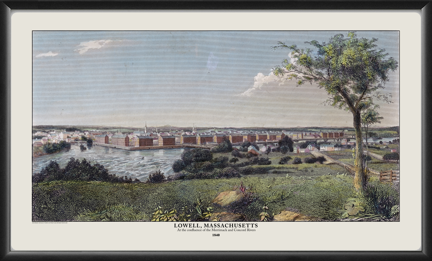 Restored panoramic engraving of Lowell, Massachusetts at the confluence of the Merrimack and Concord Rivers, with a row of textile mills and factories along the Merrimack.