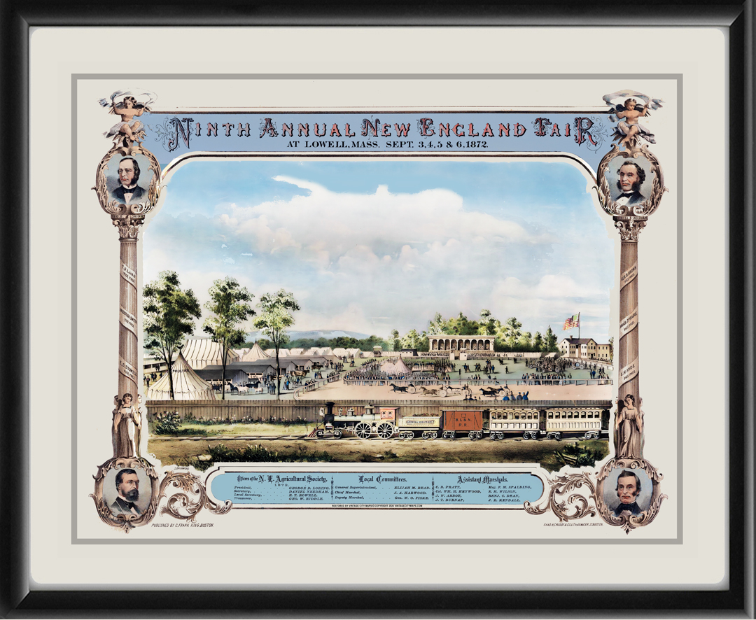 Restored bird’s eye view map of the Ninth Annual New England Fair in Lowell, Massachusetts, 1872 published by E. Frank King.
