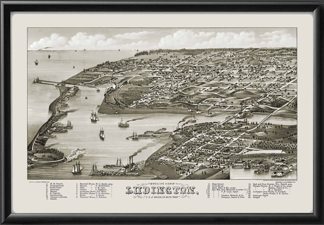 Restored bird’s eye view of Ludington, Michigan, 1880 by J.J. Stoner.