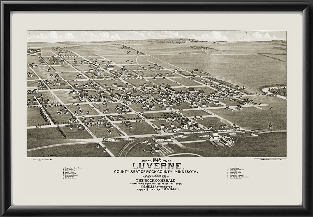Restored bird’s eye view map of Luverne, Minnesota, 1883 by Herman Brosius.