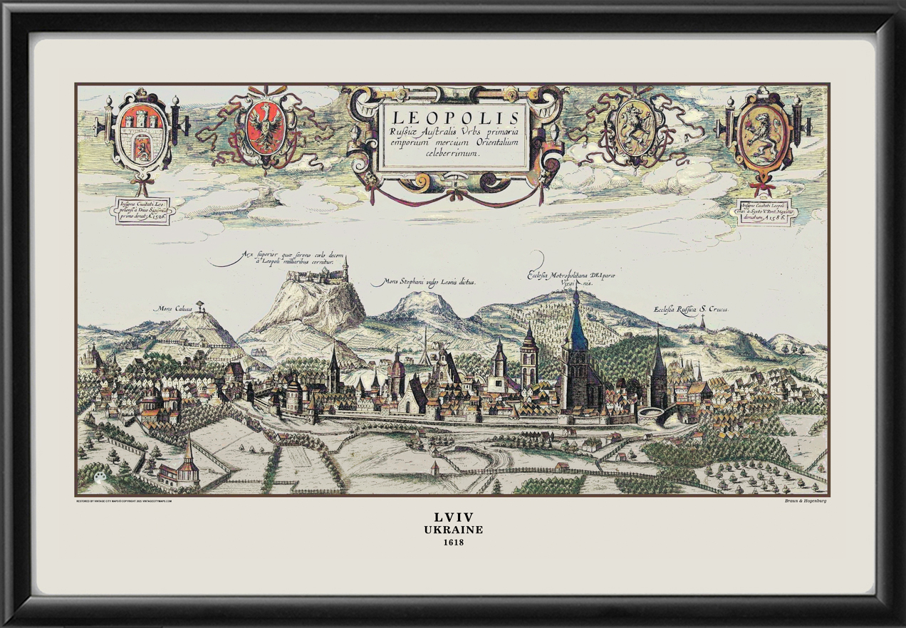 Restored bird’s eye view of Lviv (Leopolis), Ukraine, 1618 by Braun & Hogenburg from their historic work, “Civitates Orbis Terrarum”