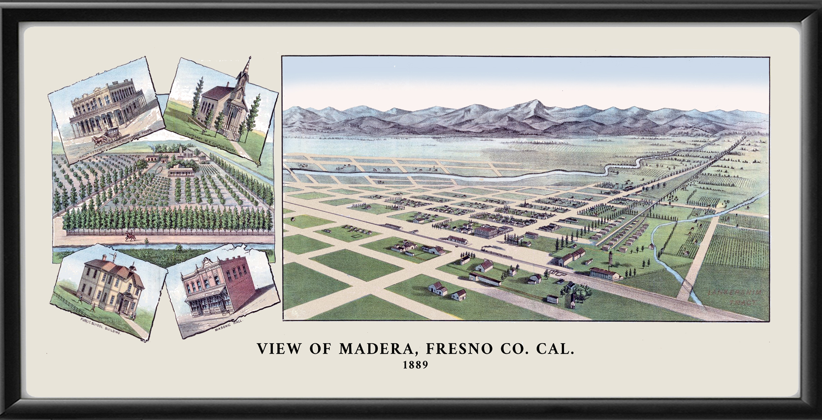 Restored panoramic view of Madera, California, 1889 by H. S. Crocker Co., with illustrations of the Yosemite Hotel, Public School, Masonic Hall, and Centenary M.E. Church.