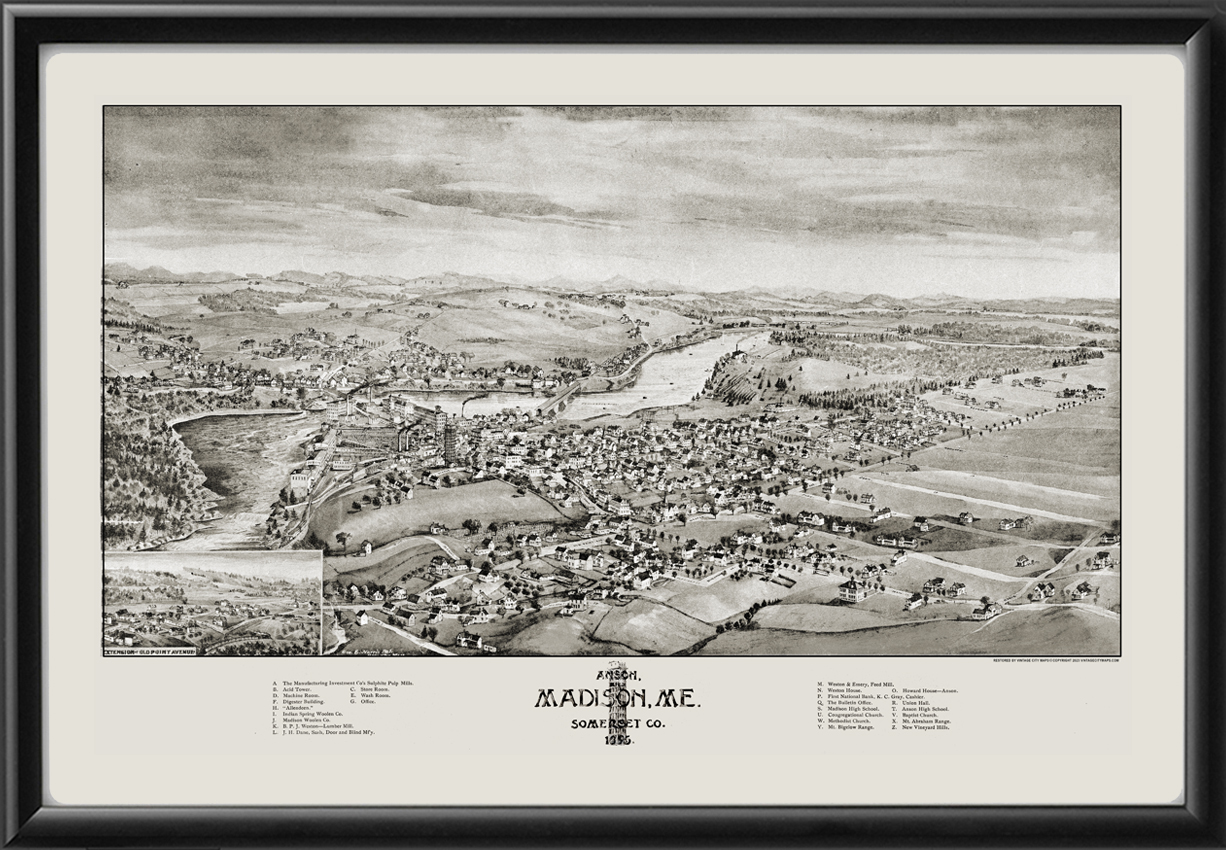 Restored bird’s eye view map of Madison and Anson, Maine, 1895 by George Norris.