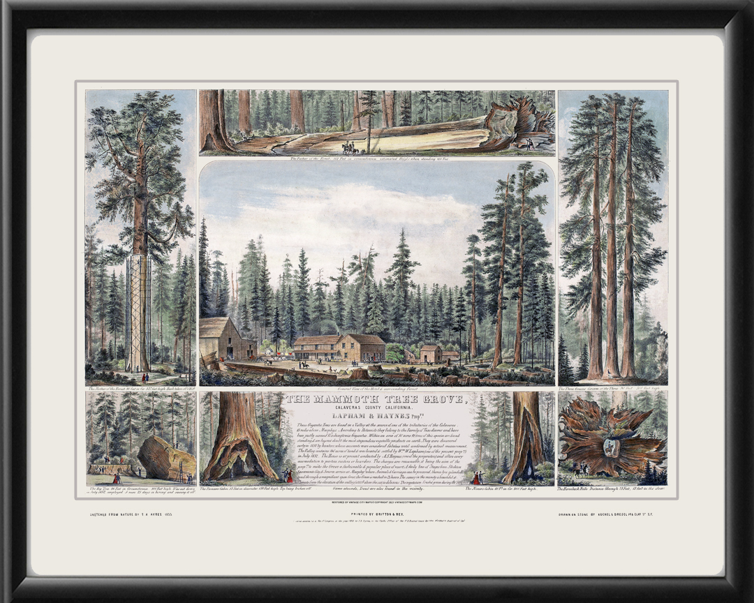 Restored view of The Mammoth Tree Grove, Calaveras County, California, 1855, showing the Father of the Forest, Mother of the Forest, Three Graces, Big Tree, Miner’s and Pioneer’s Cabin, Horseback Ride, Sentinels, and view of the hotel. Sketched by Thomas A. Ayres, and drawn on stone by Kuchel & Dresel.