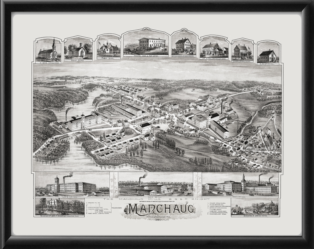 Restored bird’s eye view map of Manchaug, Massachusetts, 1891 by Oakley Hoopes Bailey, a historic district encompassing a 19th century industrial village center in Sutton.