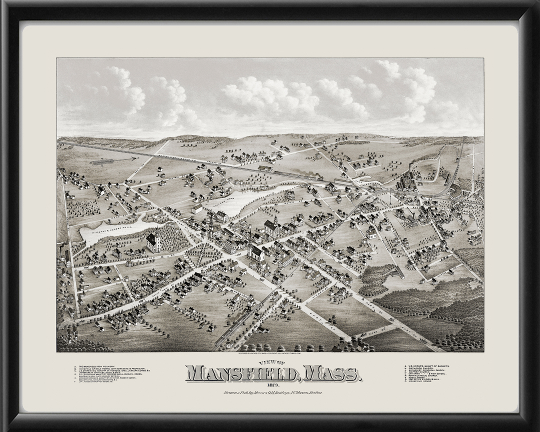 Restored bird’s eye view map of Mansfield, Massachusetts, 1879 by Oakley Hoopes Bailey.