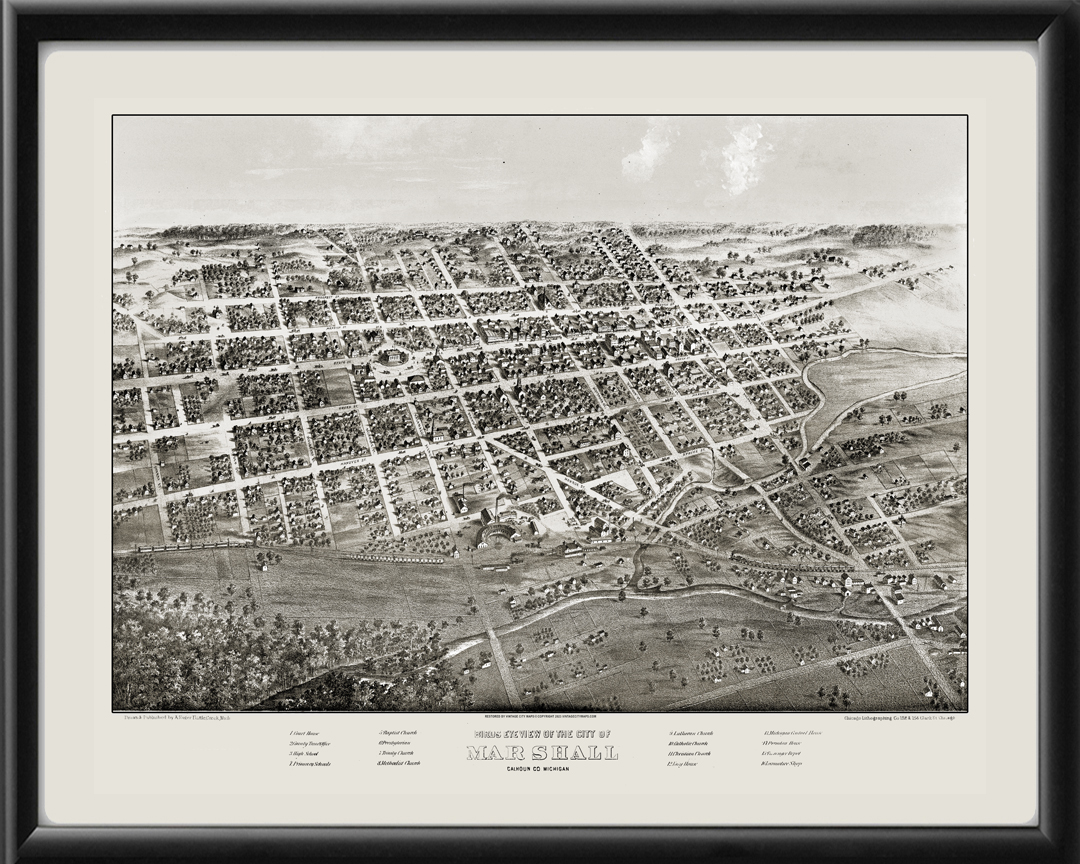 Restored bird’s eye view map of Marshall, Michigan 1868 by Albert Ruger.