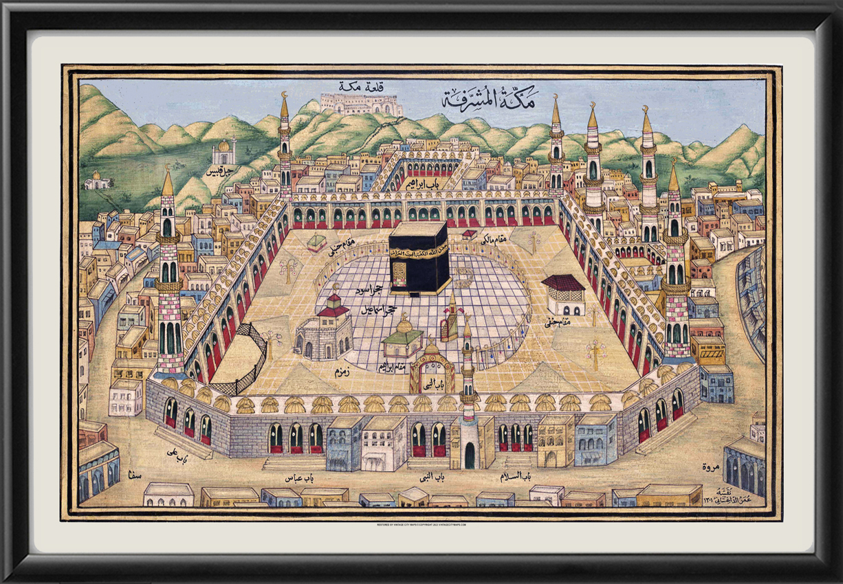Restored view of Mecca, Saudi Arabia, 1883 from Khalili Collection: Hajj and Arts of Pilgrimage. Shop our amazing collection of restored bird’s eye view and panoramic maps.
