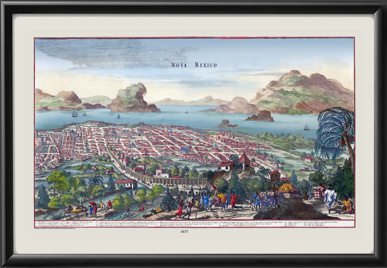 Restored bird’s eye view of Mexico City, Mexico, color version, 1671 by John Ogilby & Arnoldus Montanus.