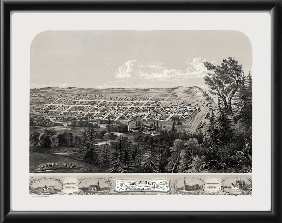 Restored panoramic view of Michigan City, Indiana 1869 by Albert Ruger.