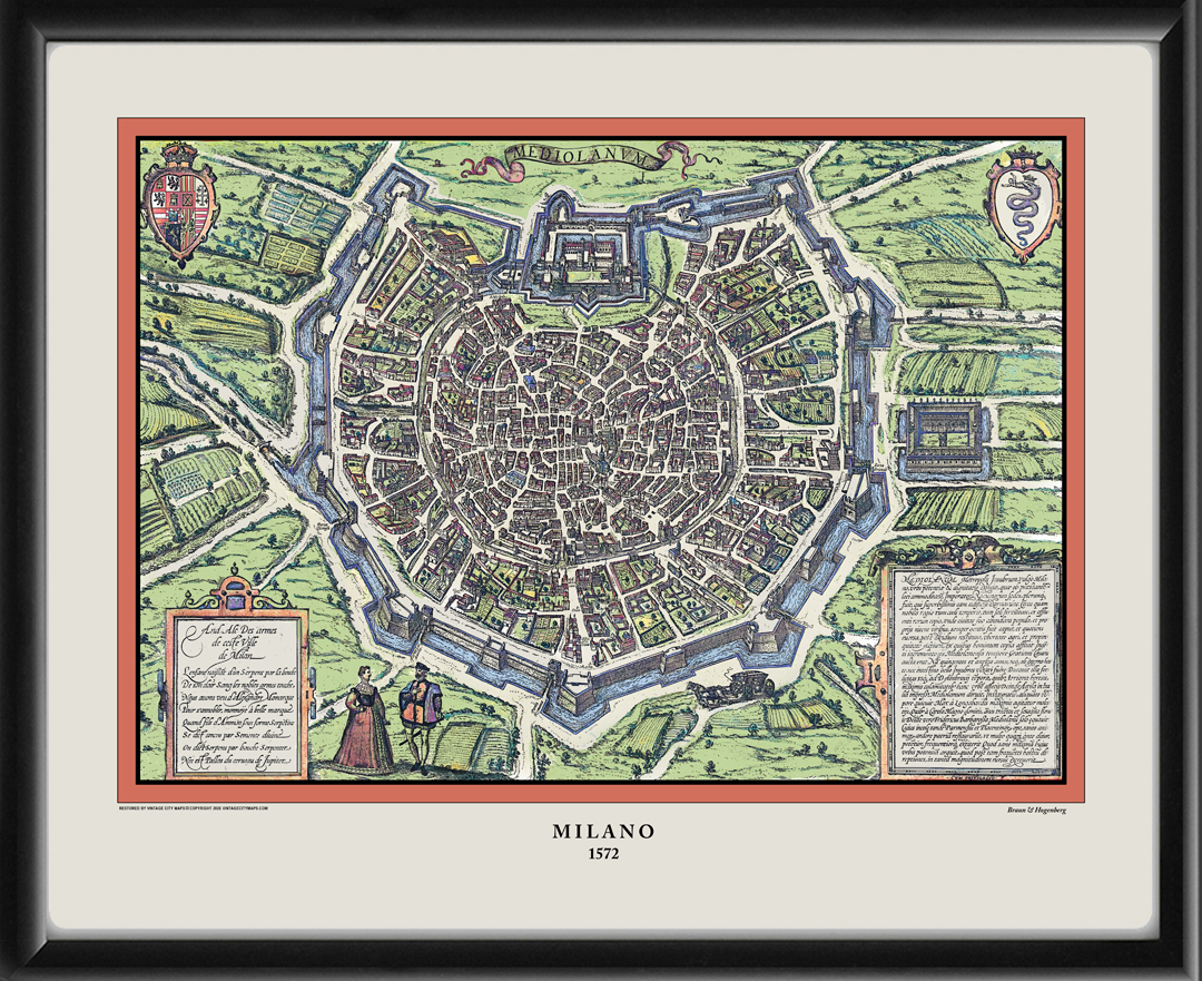 Restored bird’s eye view map of Mediolanum, commonly known as Milan, Italy, 1572 by Georg Braun and Frans Hogenberg from their 6-volume atlas, “Civitates Orbis Terrarum”