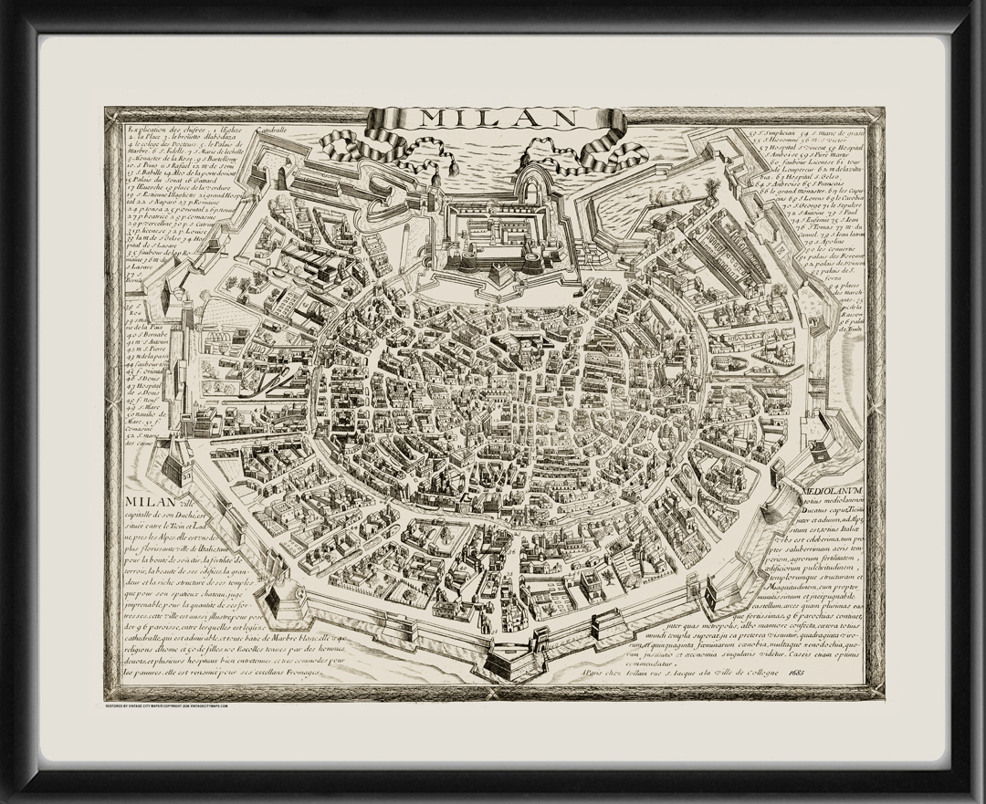 Restored bird’s eye view map of Milan, Italy, circa 1685 from the original engraving by François Jollain