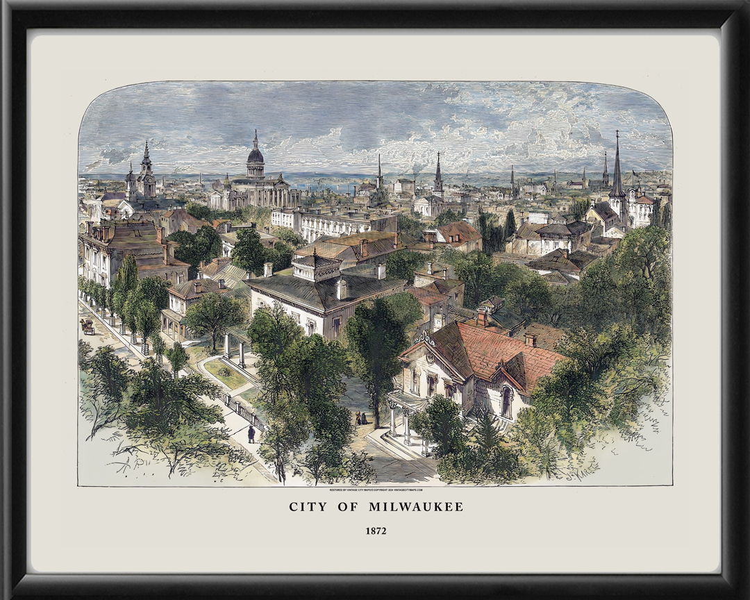 Restored bird’s eye view of the City of Milwaukee, Wisconsin, 1872 from the original wood engraving published in Illustrated London News.