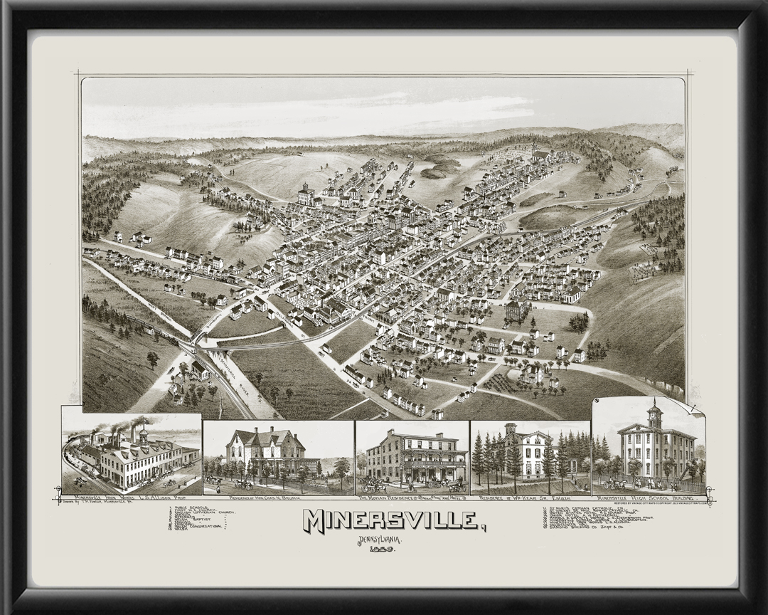 Restored bird’s eye view map of Minersville, PA 1889 by Thaddeus Mortimer Fowler.