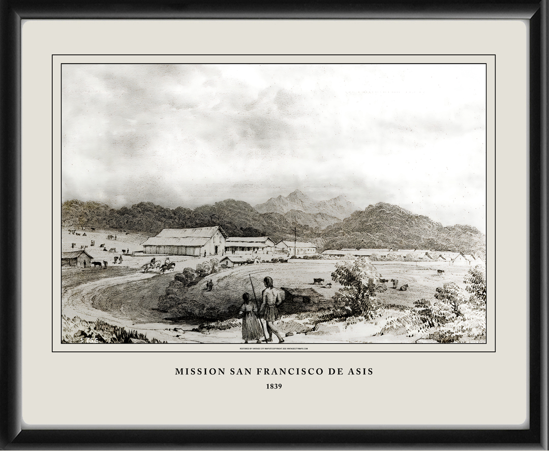 Restored bird’s eye view of Mission Dolores (Mission San Francisco de Asís), San Francisco, 1839 by lithographer Captain William Smyth, R.N. The mission was founded on October 9, 1776, by Friars Francisco Palóu and Pedro Benito Cambón