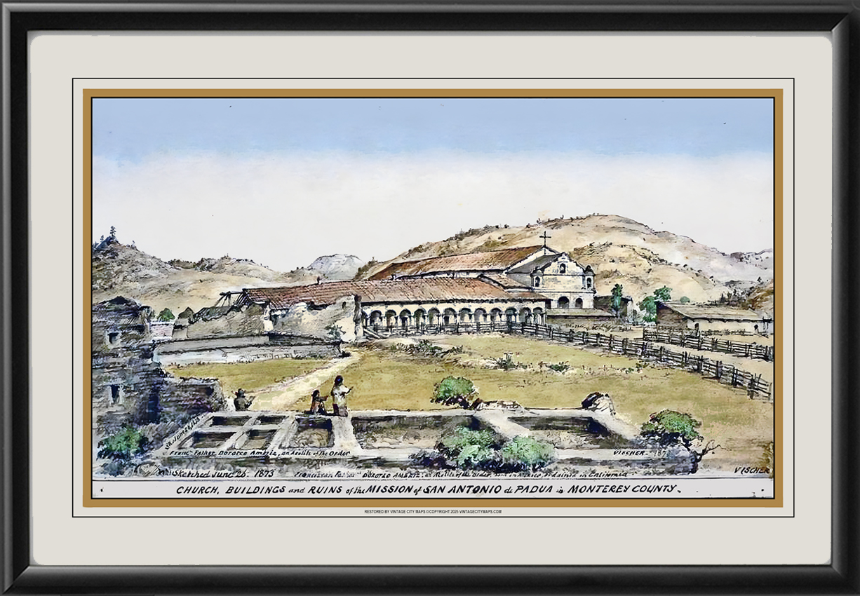 Restored view of Mission San Antonio de Padua, 1873 by Edward Vischer, located on the Hunter Liggett Military Reservation near Jolon, California. Founded on July 14, 1771, it was the third mission established by Father Junípero Serra.