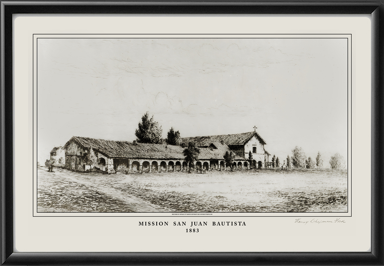 Restored view of Mission Mission San Juan Bautista, in San Juan Bautista, California, 1883 by Henry Chapman Ford, founded on June 24, 1797, by Fermín de Lasuén of the Franciscan order, named for Saint John the Baptist