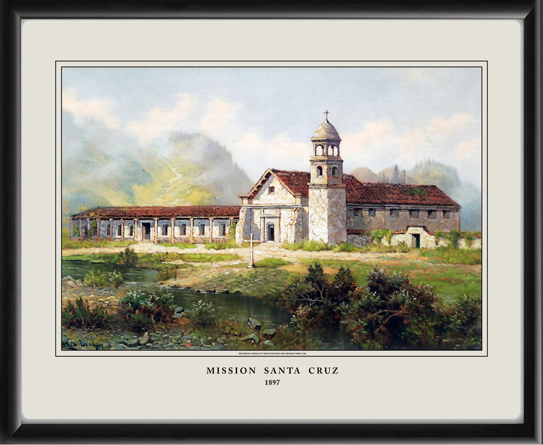 Restored view of Mission Santa Cruz – The Mission of the Exaltation of the Holy Cross – in Santa Cruz, California, 1897 from the original oil painting by Edwin Deaken. The mission was founded on August 28, 1791, by Father Fermín Francisco de Lasuén, the successor to Father Junipero Serra.