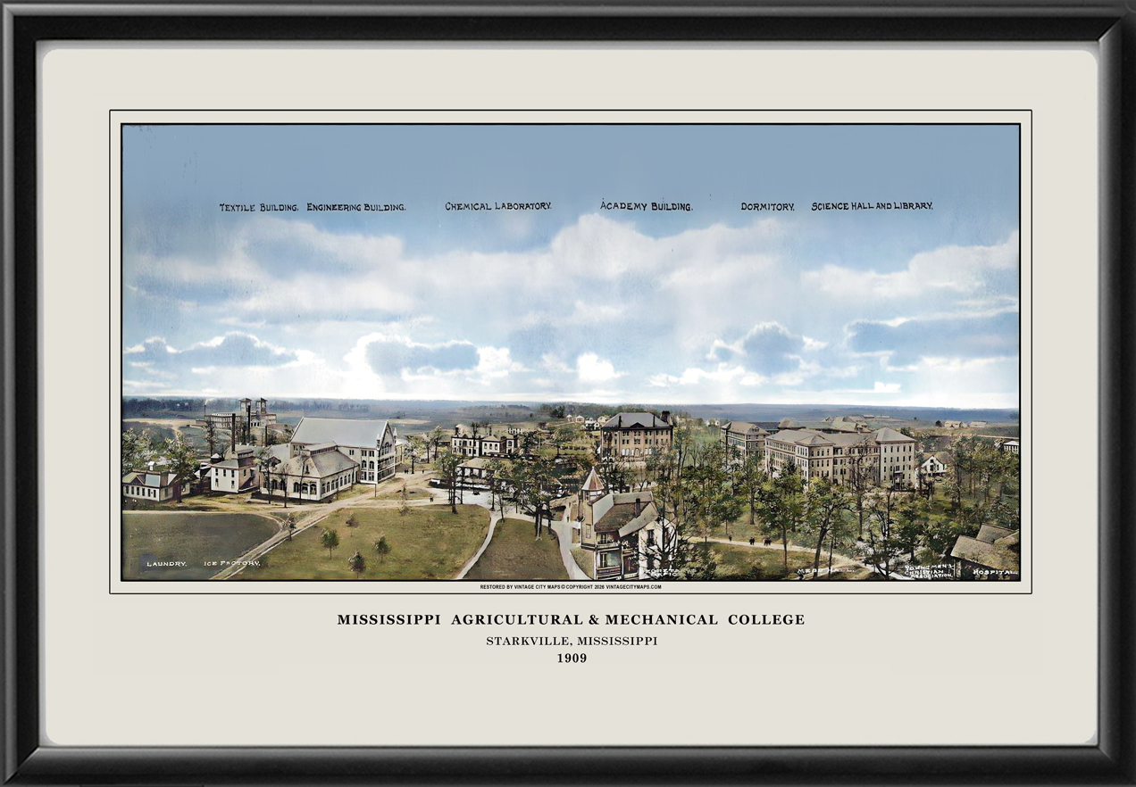 Restored bird’s eye view of Mississippi State University, formerly Mississippi Agricultural and Mechanical College, Starkville, Mississippi, 1909.