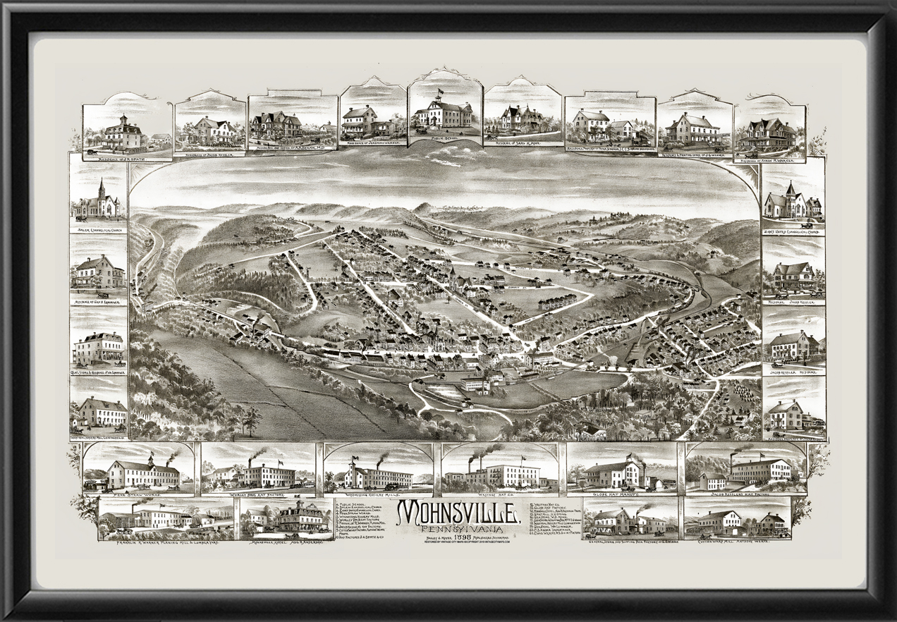 Restored bird’s eye view map of Mohnton (formerly Mohnsville), Pennsylvania, 1898 by Bailey and Moyer.