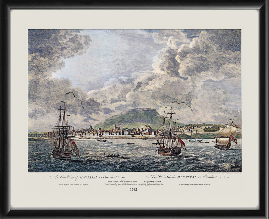 Restored panoramic view of Montreal, Quebec, Canada, from the St. Lawrence River, 1762 by Thomas Patten showing fortifications, dwellings, churches, ships with British flags, and boats.