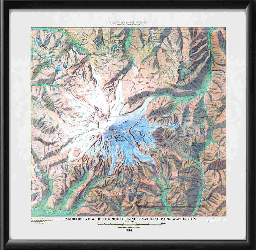 Restored panoramic map of Mount Rainier National Park, Washington 1914 by John H. Renshawe
