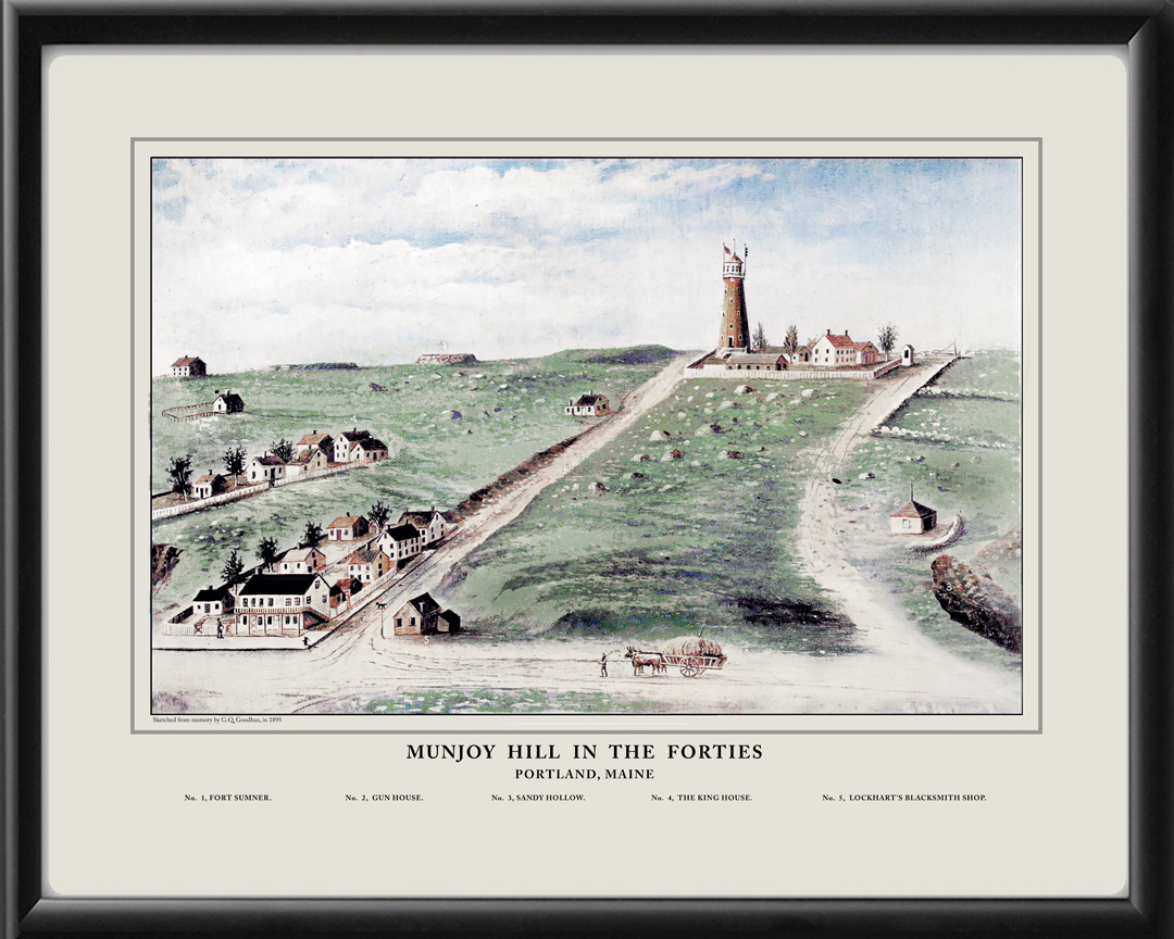 Restored view of Munjoy Hill, Portland, Maine in the 1840’s, sketched by Charles Quincy Goodhue, drawn from memory in 1895.