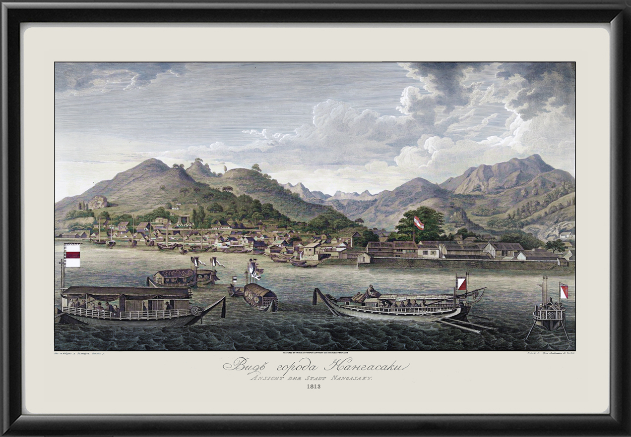 Restored bird’s eye view of Nagasaki, Japan, 1813 from the original engraving by Wilhelm Gottlieb Tilesius