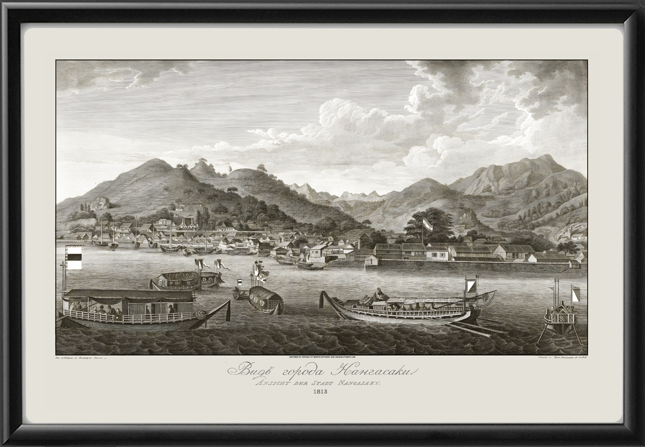 Restored bird’s eye view of Nagasaki, Japan, 1813 from the original engraving by Wilhelm Gottlieb Tilesius