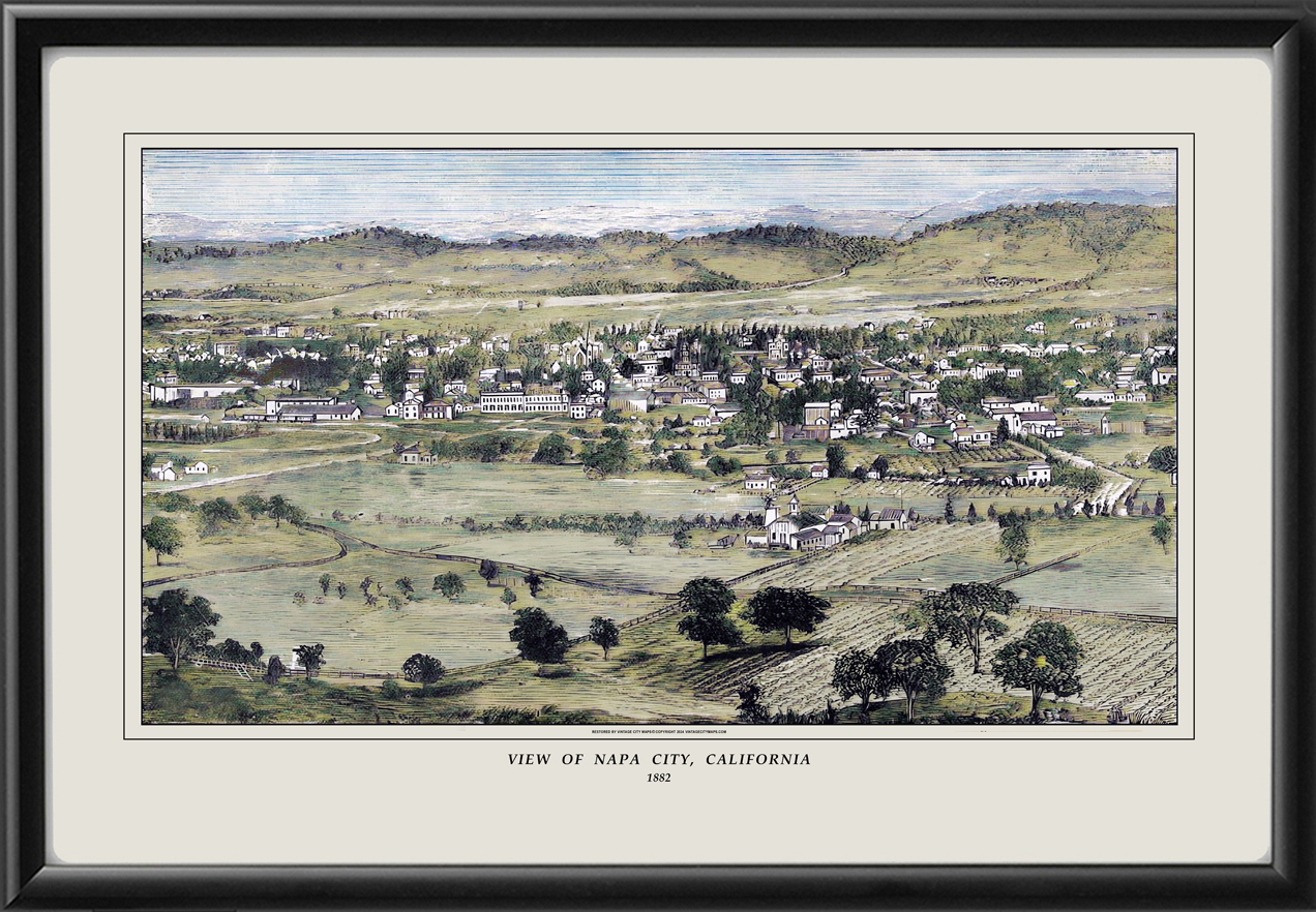 Restored bird’s eye view of Napa City, California, 1882, from the original wood engraving.