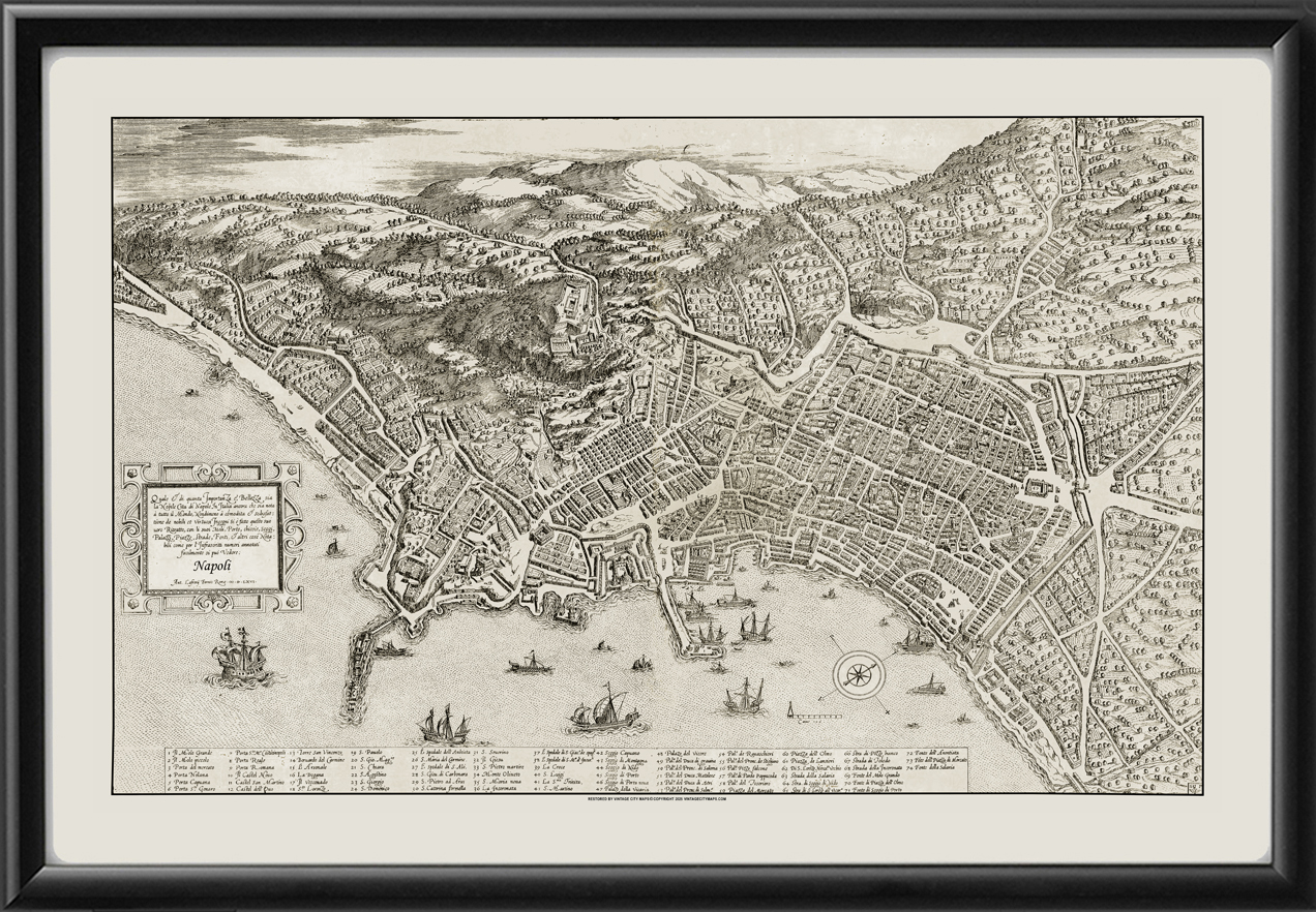 Restored bird’s eye view map of Naples, Italy, 1566 by Antonio Lafreri