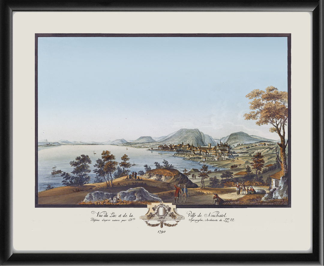 Restored bird’s eye view of the lake and town of Neuchâtel, Switzerland, 1790 by Niklaus Sprüngli