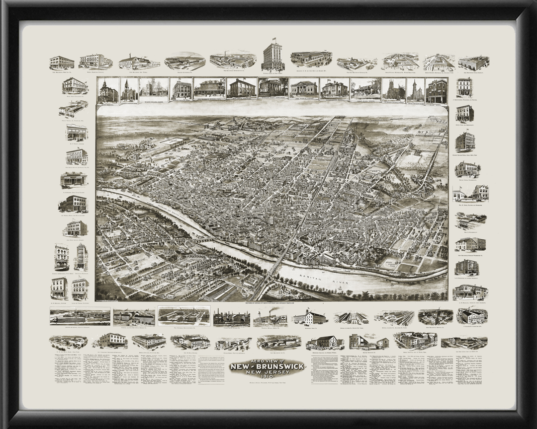 Restored bird’s eye view map of New Brunswick, New Jersey, 1910 by Hughes and Bailey.