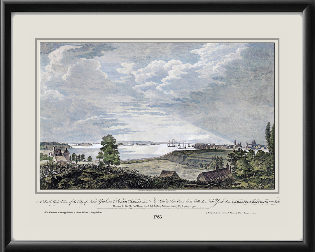 Restored view of New York City, 1763 drawn on the spot by Capt. Thomas Howdell, of the Royal Artillery, and engraved by Pierre Canot. The view looks south from a point near the present intersection of Henry and Montgomery Streets on the Lower East Side.