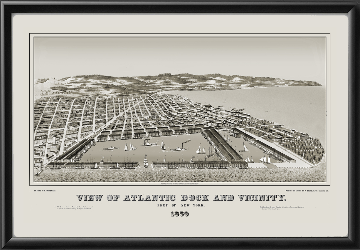 Restored bird’s eye view map of Atlantic Docks and Vicinity, Port of New York, 1850 showing Red Hook and Carroll Gardens, and Brooklyn in the background by Edwin Whitefield