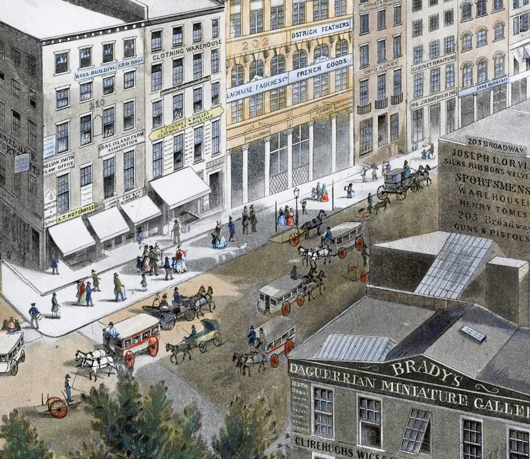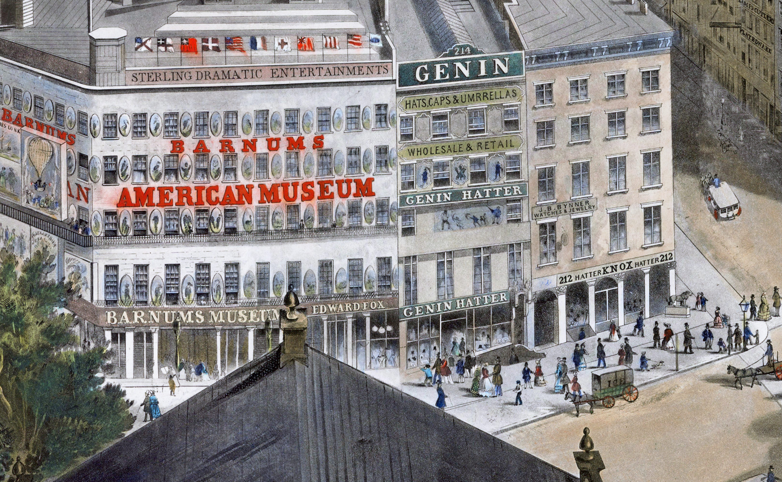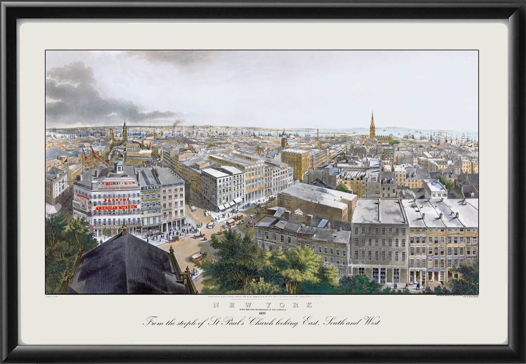 Restored bird’s eye view of New York City, NY, 1855 by J. W. Hill. From the steeple of St. Paul’s Church at the intersection of Broadway and Vesey St., looking east, south, and west. Also pictured is the P.T. Barnum’s American Museum, which was destroyed by fire in 1865.