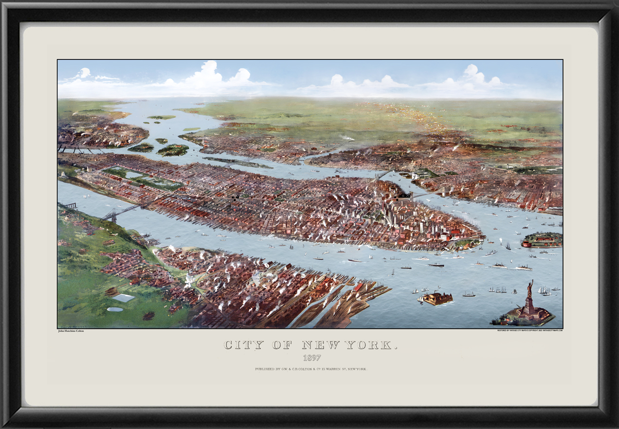 Restored bird’s eye view map of New York City, New York, 1897 by Joseph Hutchins Colton