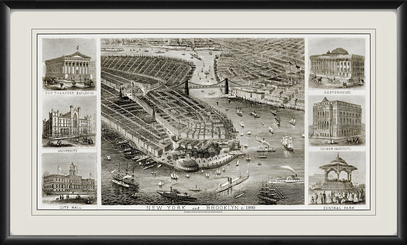 Restored bird’s eye view of New York City and Brooklyn, NY circa 1890, with additional illustrations including the Sub Treasury Building, City Hall, Custom House, Central Park, and Cooper Institute.