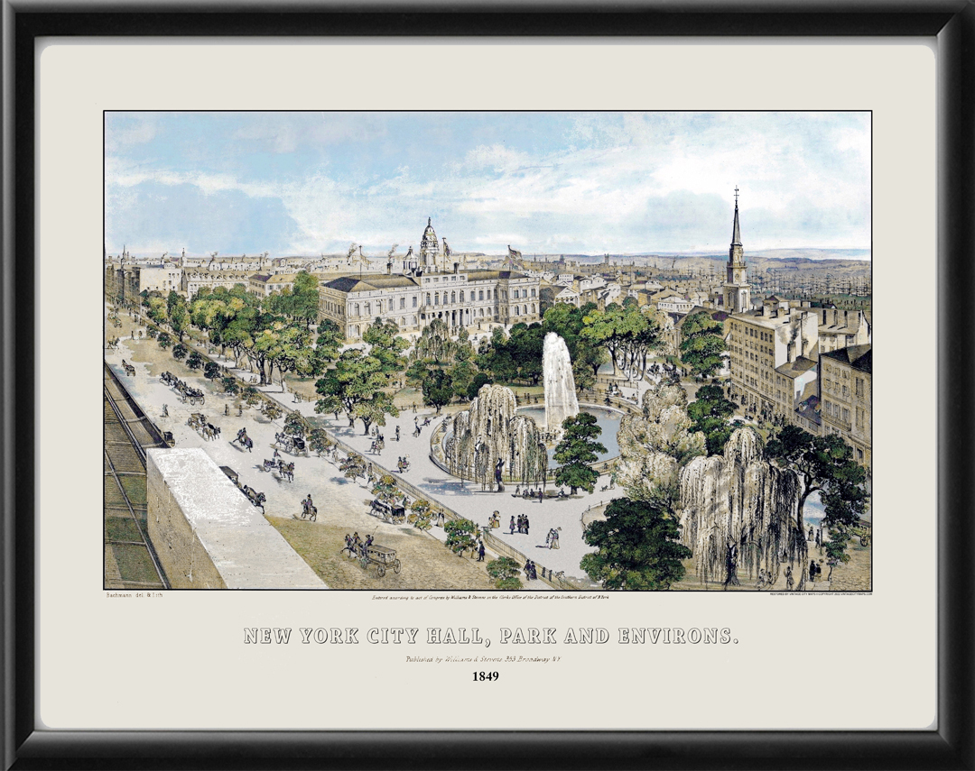Restored bird’s eye view of New York’s City Hall, Park & Environs, 1849 by John Bachmann.