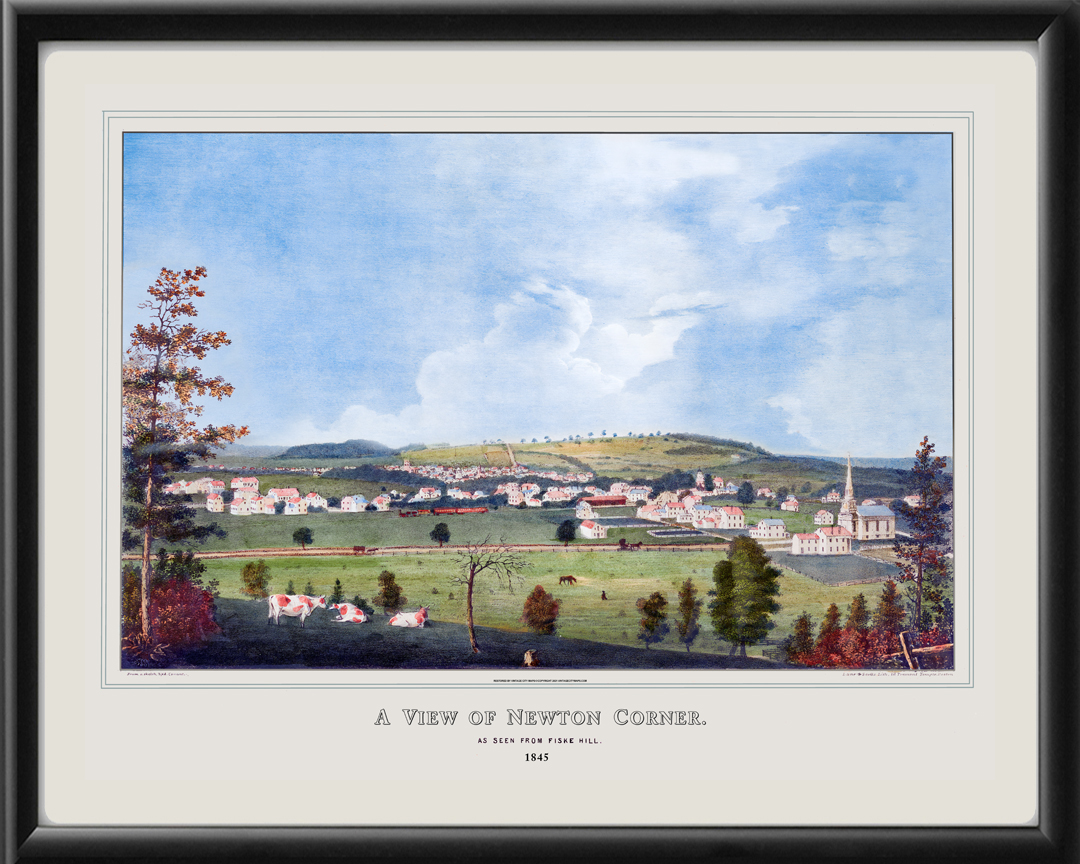 Restored bird’s eye view of Newton Corner, a neighborhood in Newton, Massachusetts, as seen from Fiske Hill, circa 1845 by Albert Conant.