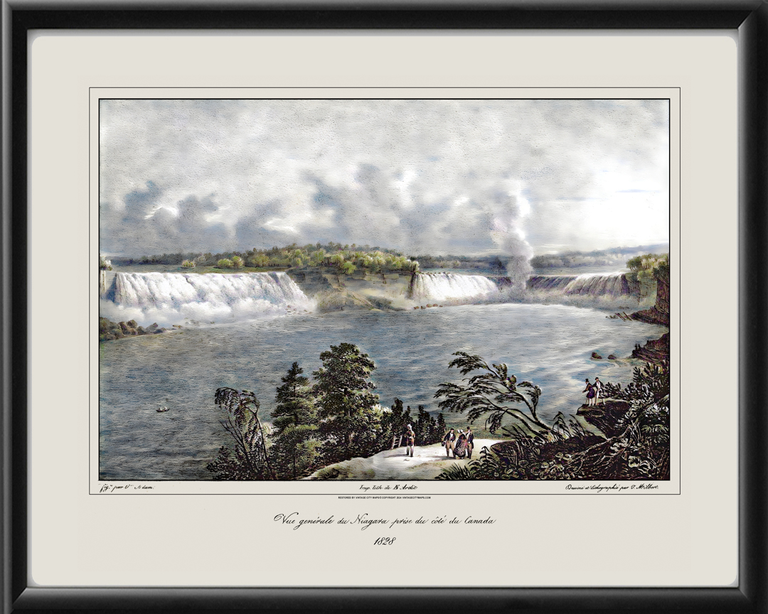 Restored view of Niagara Falls, Canada, 1828 by Jacques Milbert.