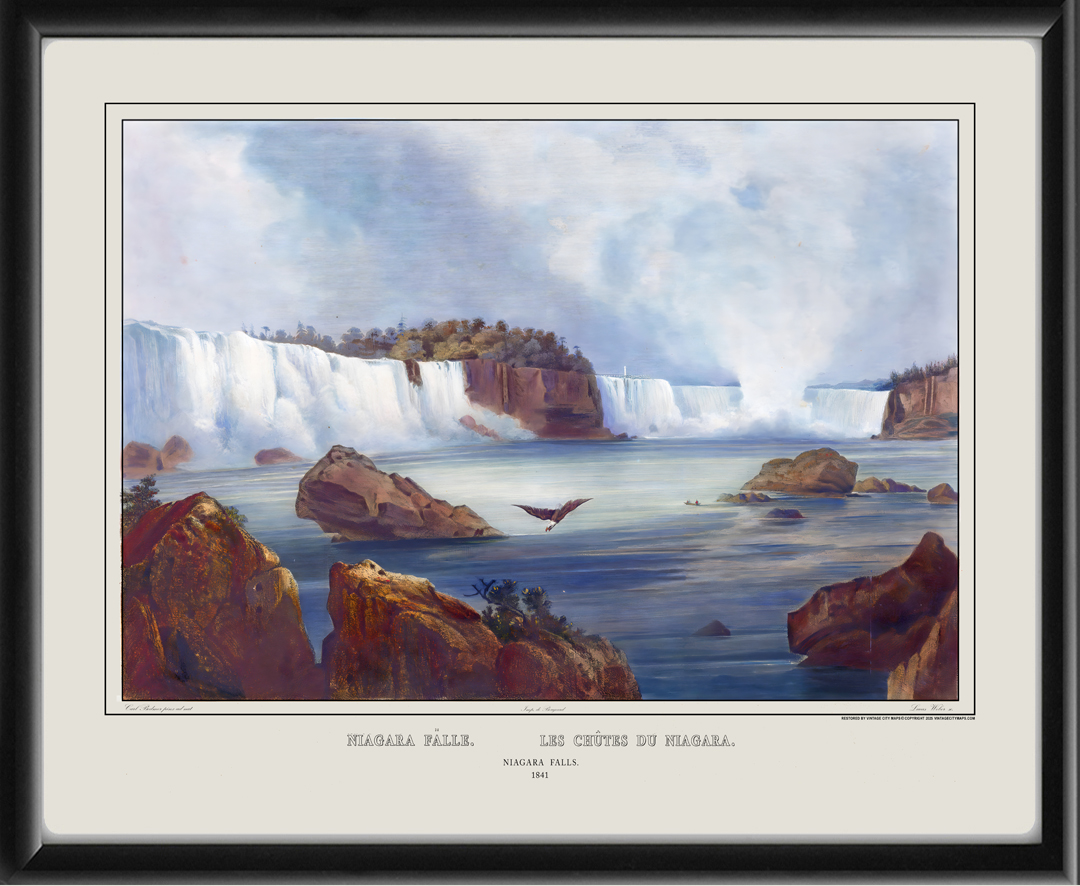 Restored bird’s eye view of Niagara Falls from the Canadian side, 1841 by Karl Bodmer
