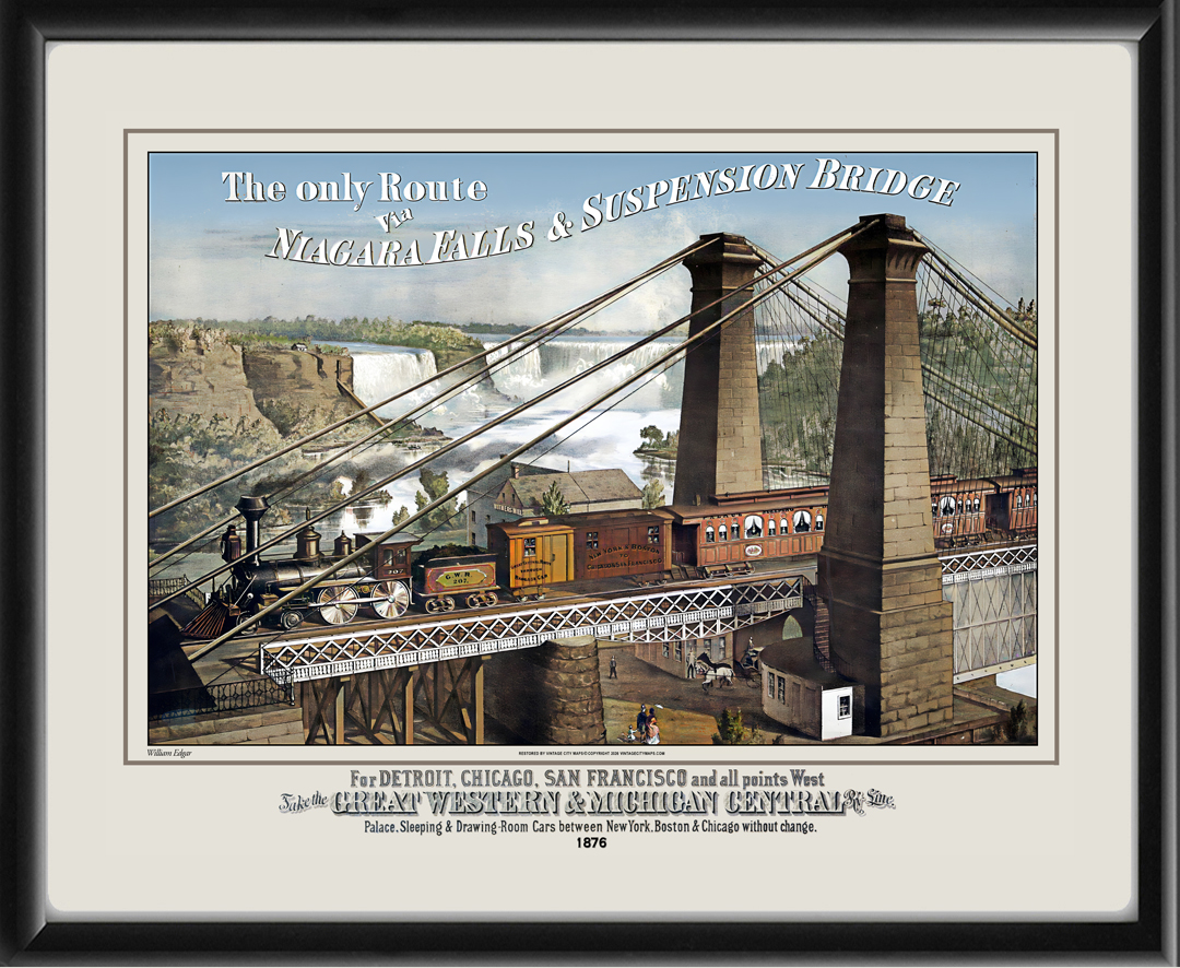 Restored bird’s eye view of the only route via Niagara Falls & suspension bridge, 1876 by William Edgar