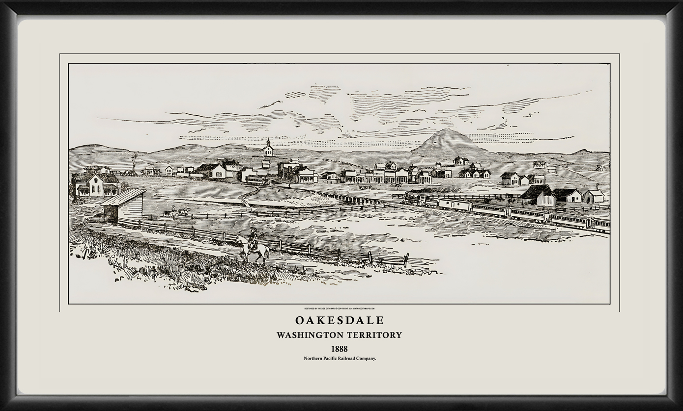 Restored panoramic view of Oakesdale, Washington Territory, 1888 from the original engraving published by the Northern Pacific Railroad Company.