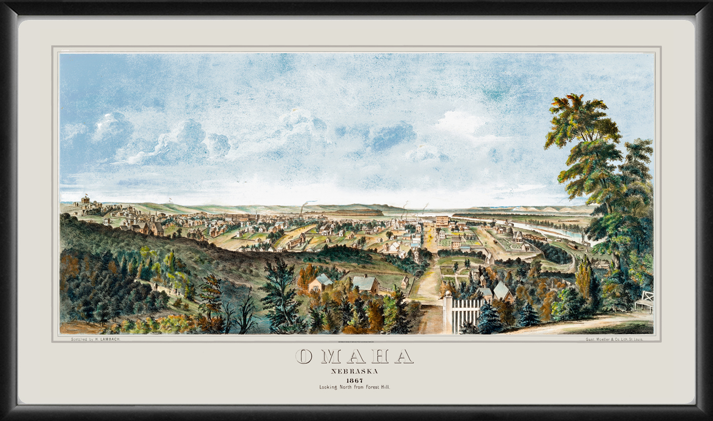 Restored panoramic bird’s eye view of Omaha, Nebraska, 1867 by H. Lambach.
