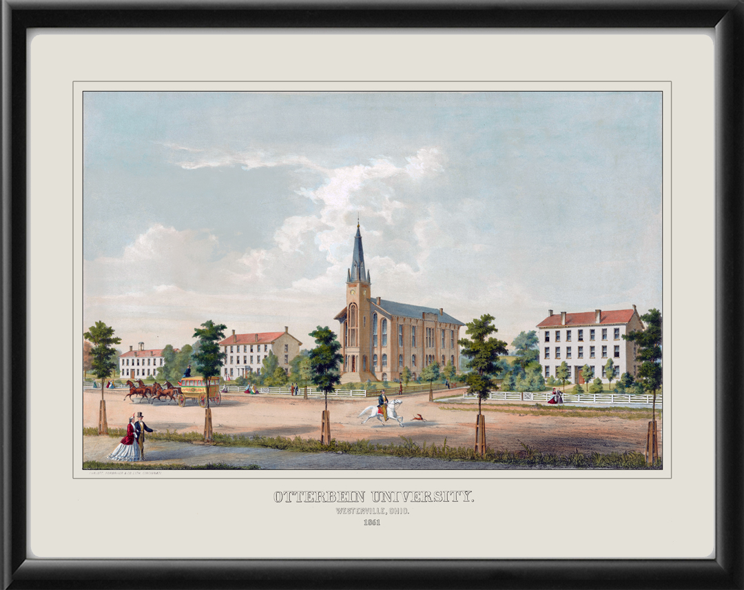 Restored view of the original buildings at Otterbein University in Westerville, Ohio, 1861 before they burned down. Printed by Ehrgott, Forbriger & Co.