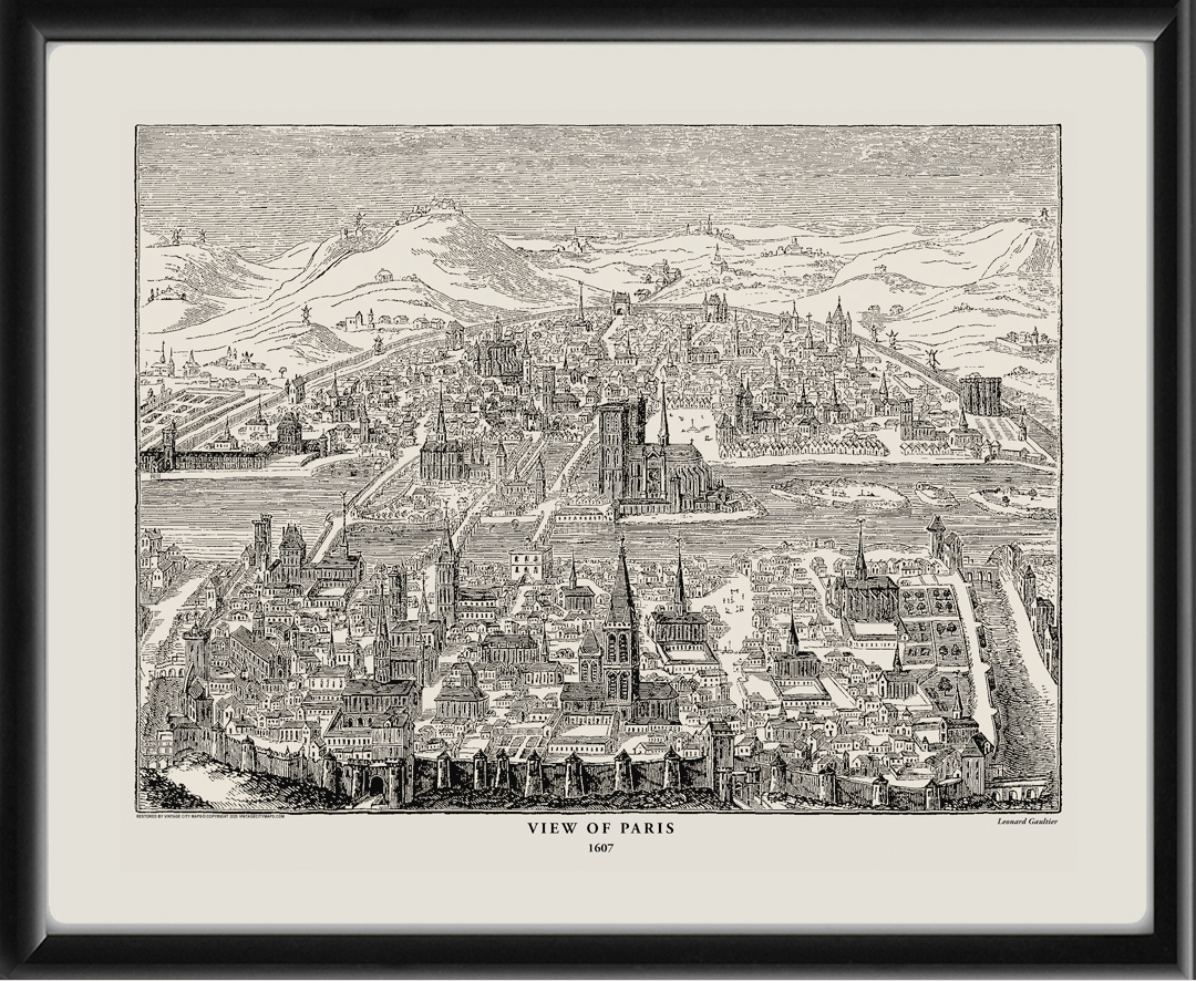 Restored bird’s eye view map of Paris, France 1607 from the original wood engraving by Leonard Gaultier