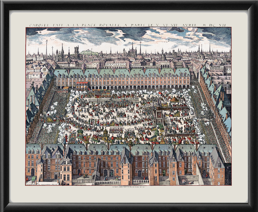 Restored bird’s eye view of carousel performed on the Royal Palace in Paris on April 5, 1612 by order of Queen Marie de Medici, on the occasion of the double alliance contracted between France and Spain, by Claude Chastillon and later published by Matthaus Merian in 1648